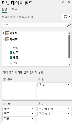 - 매출을 날짜나 지역별로 분석하려면 날짜 또는 지역 필드를 행 또는 열 영역으로 끕니다.