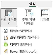 - 삽입 을 선택한 다음 피벗 테이블 아래의 아래쪽 화살표를 선택합니다.